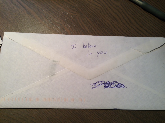 When I realized what the envelope was, I began to tear it open — excited and anxious to read it. Then caution took hold and I placed the envelope in my purse, wanting to consider it for a while before I opened it. I finally opened it today and read through it quickly. It was … interesting, to say the least. (oh — and the note on the back was not written by me…Thanks, Kary!!)